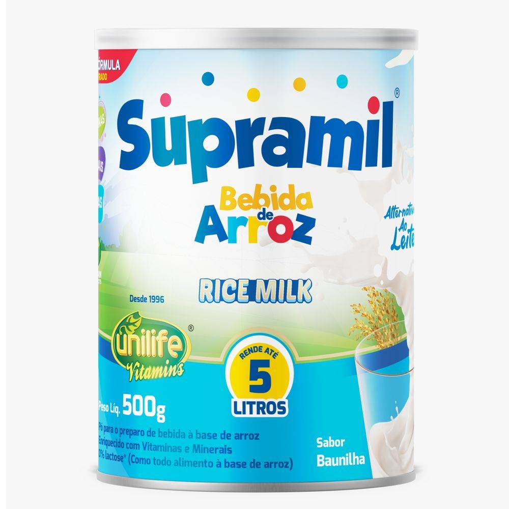 Bebida de Arroz Kids Supramil Baunilha 500g da Unilife, é uma bebida vegetal à base de arroz, enriquecida com vitaminas e minerais, ideal para crianças.