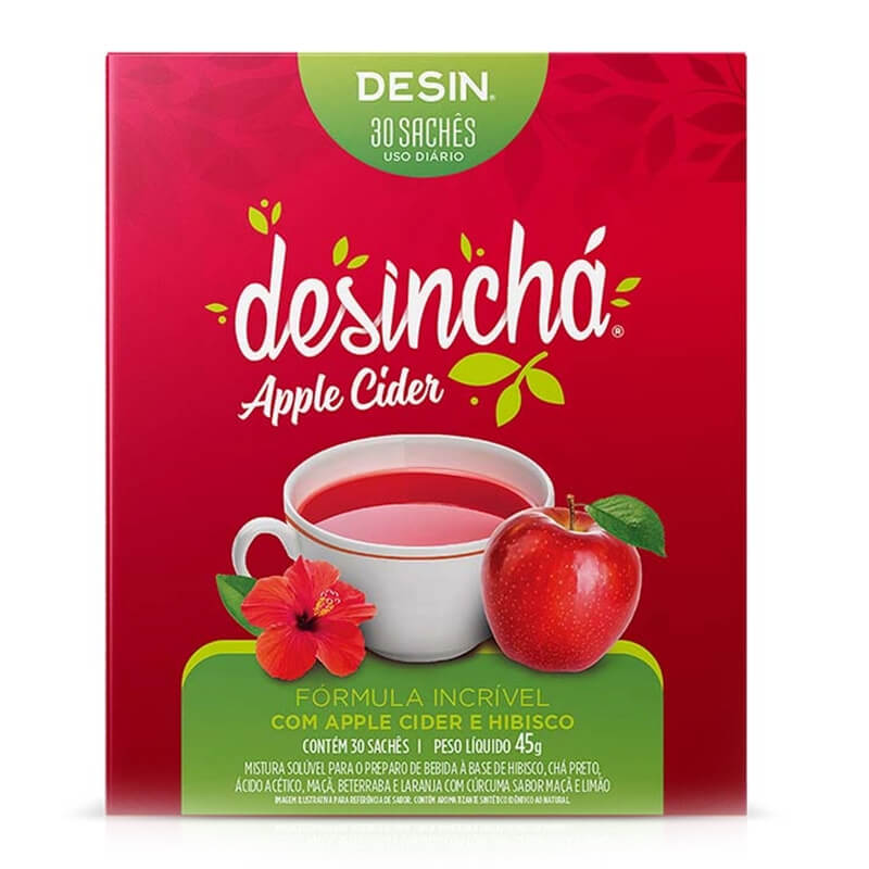 Desinchá Apple Cider sabor maçã e limão é um chá com um blend exclusivo de hibisco, chá preto, ácido acético, maçã, beterraba e laranja com cúrcuma.