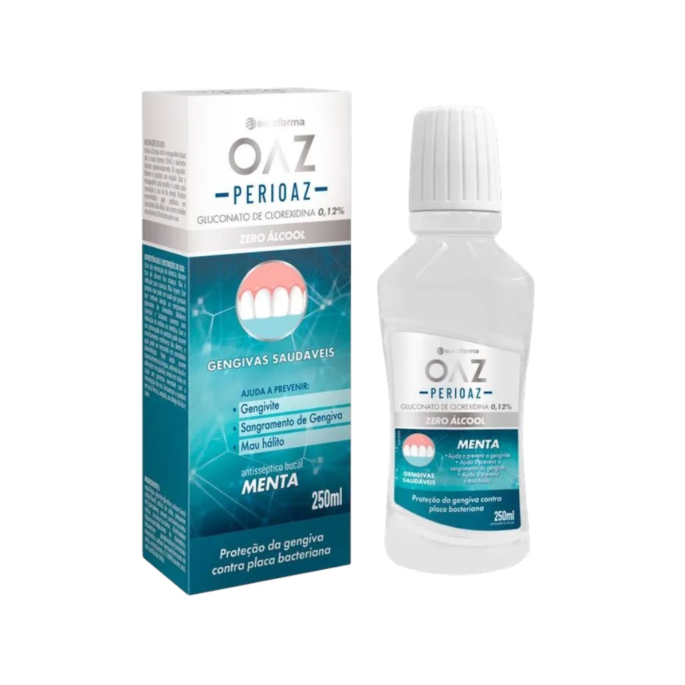 Perioaz é um enxaguante bucal zero álcool 0,12% ccomposto por gluconato de clorexidina.