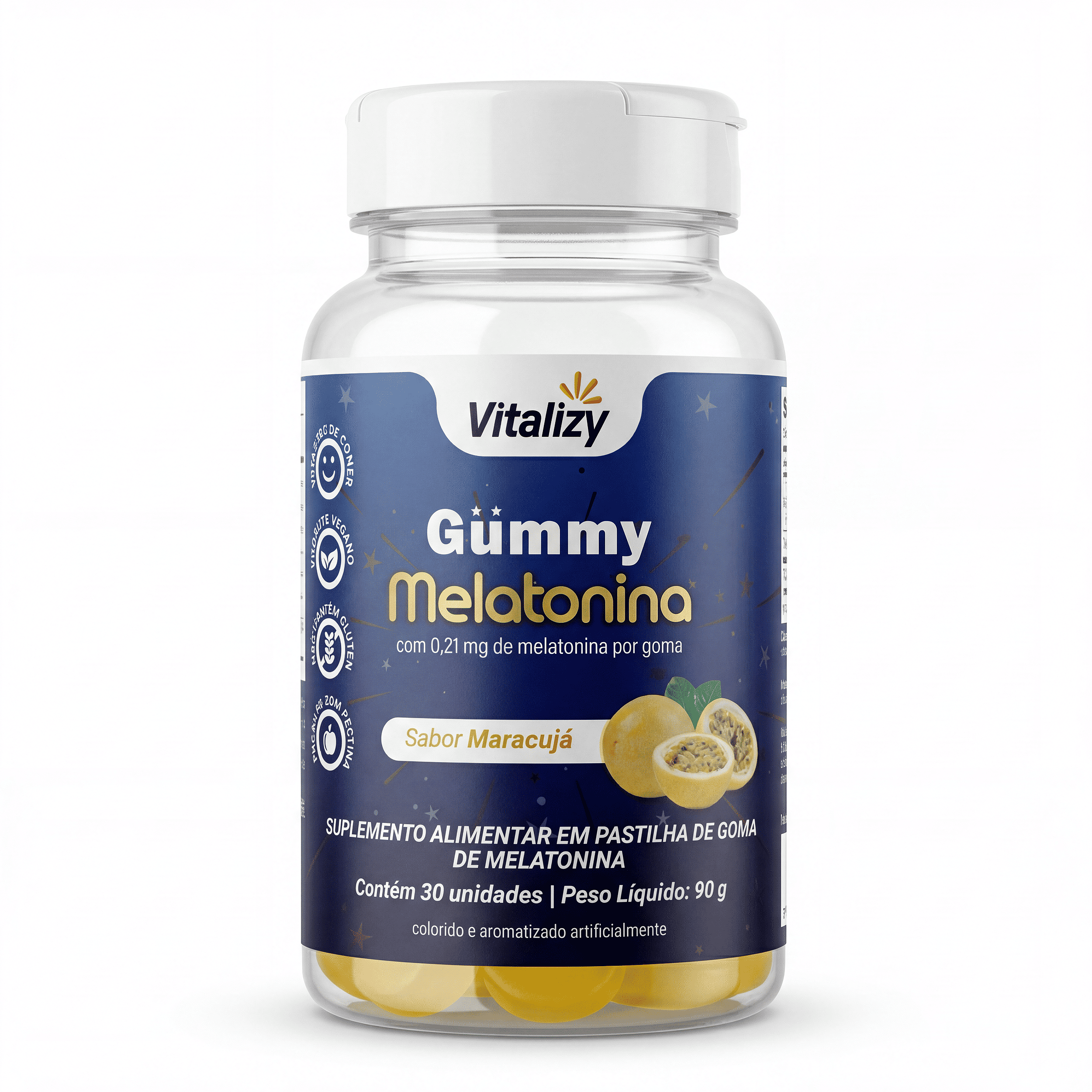 VITALIZY GUMMY MELATONINA | SABOR MARACUJÁ | 30 GOMAS Suplemento alimentar em goma mastigável com 0,21 mg de melatonina por porção. Sabor natural de maracujá, produzido com pectina vegetal (100% vegano), sem glúten e com baixo valor calórico (10 kcal por goma). Formato prático — basta mastigar 1 goma ao dia, sem necessidade de água. Especificações: - Melatonina: 0,21 mg por goma - Quantidade: 30 gomas (90 g) - Vegano (pectina vegetal) - Sem glúten | Sem lactose - Sabor: Maracujá natural - Fabricação: Brasil Advertências: Este produto não é um medicamento e não substitui alimentação equilibrada. Exclusivo para adultos a partir de 19 anos. Não indicado para gestantes, lactantes, crianças e pessoas que desempenham atividades que requerem atenção constante. Pessoas com enfermidades ou em uso de medicamentos devem consultar um médico antes de consumir.