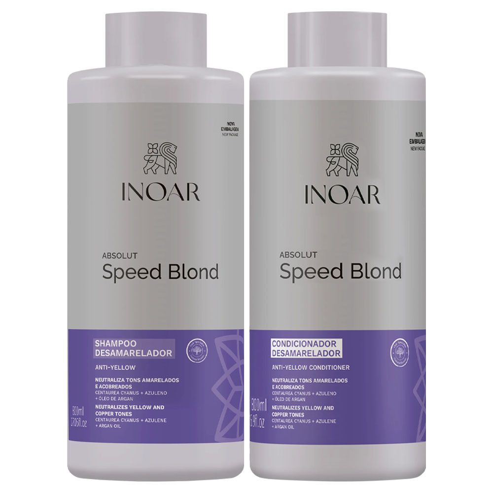 Kit com shampoo e condicionador para cabelos loiros ou grisalhos. Inoar Absolut Speed Blond auxilia no combate ao amarelado indesejado.