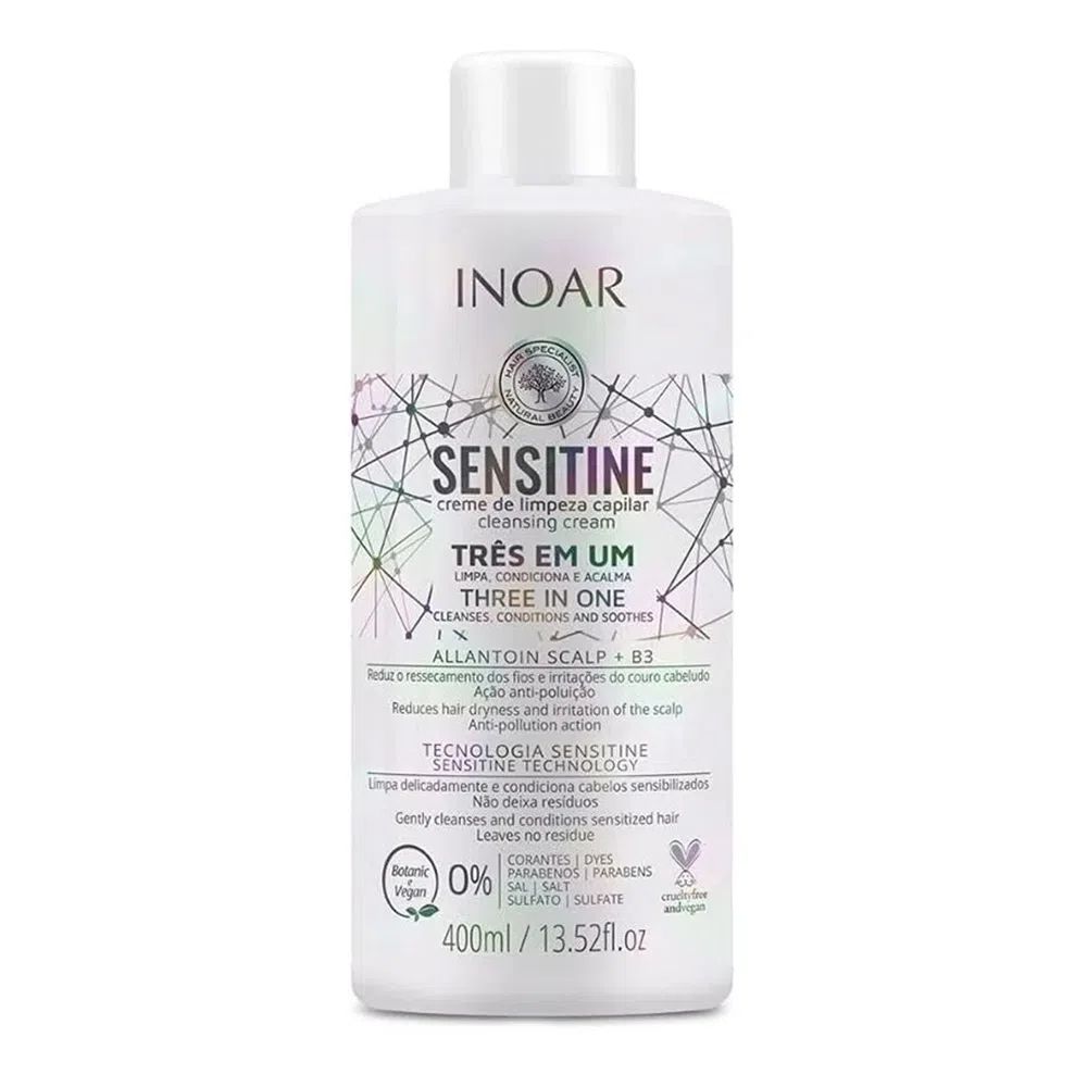 Um creme de limpeza, Inoar Sensitine conta com uma fórmula e tecnologias inovadoras. Combina agentes de limpeza com ativos poderosos que evitam o ressecamento e irritações no couro cabeludo, além de condicionar suavemente sem pesar. Protege os fios da poluição e os torna mais brilhantes, macios e saudáveis.