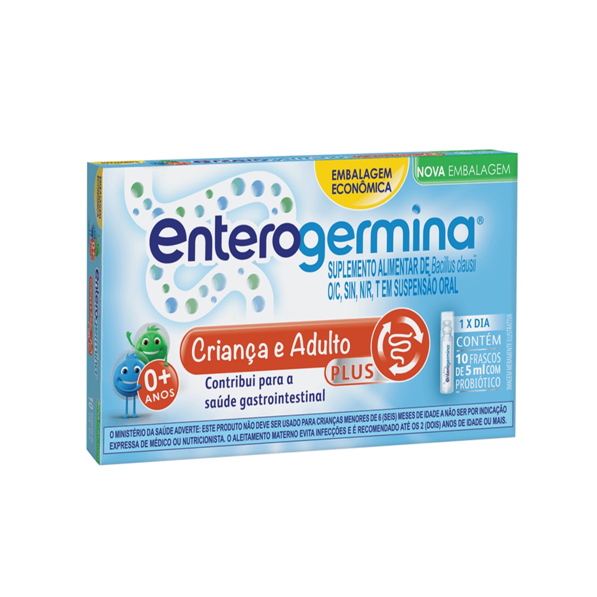 O Enterogermina Plus é um probiótico que contribui para o equilíbrio da flora intestinal, indicado para pessoas com desconforto intestinal. Cada flaconete de 5ml é composto por água e cerca de 4 bilhões de esporos de Bacillus clausii, microrganismos conhecidos também como bactérias boas, capazes de chegarem vivos no intestino, em que formam uma barreira protetora contra germes e/ou agentes agressores, restabelecendo o equilíbrio da flora intestinal. O Bacillus clausii ainda é capaz de induzir a produção de vitaminas, principalmente as do complexo B. O consumo do Enterogermina deve estar associado a uma alimentação equilibrada e hábitos de vida saudáveis.