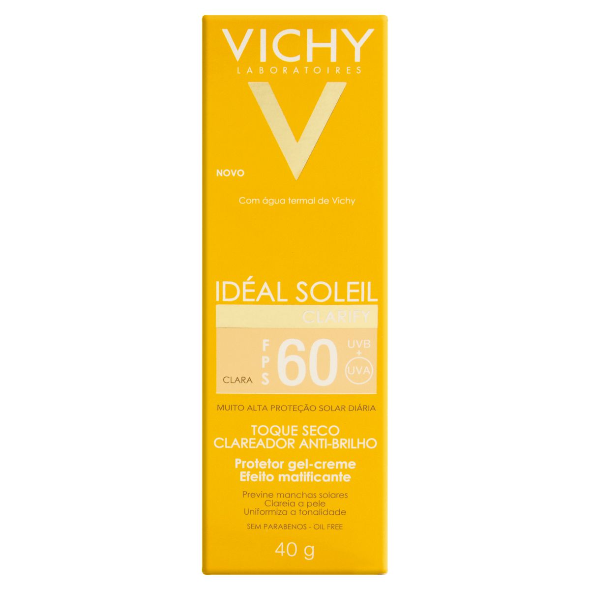 O Protetor Solar Vichy Ideal Soleil Clarify é ideal para peles mistas e oleosas. De uso diário e facial, o produto foi criado para se adaptar às cores mais claras da pele, com ação clareadora que diminui as manchas solares, e disfarça as imperfeições. Desenvolvido em textura leve de gel creme, possui toque seco e suave com efeito matte, que uniformiza o tom da derme com alta cobertura. Ele ainda tem alta absorção de oleosidade, e cobertura de maquiagem dermatológica, além de ter FPS 60, protegendo contra os raios solares UVA, UVB e luz visível.