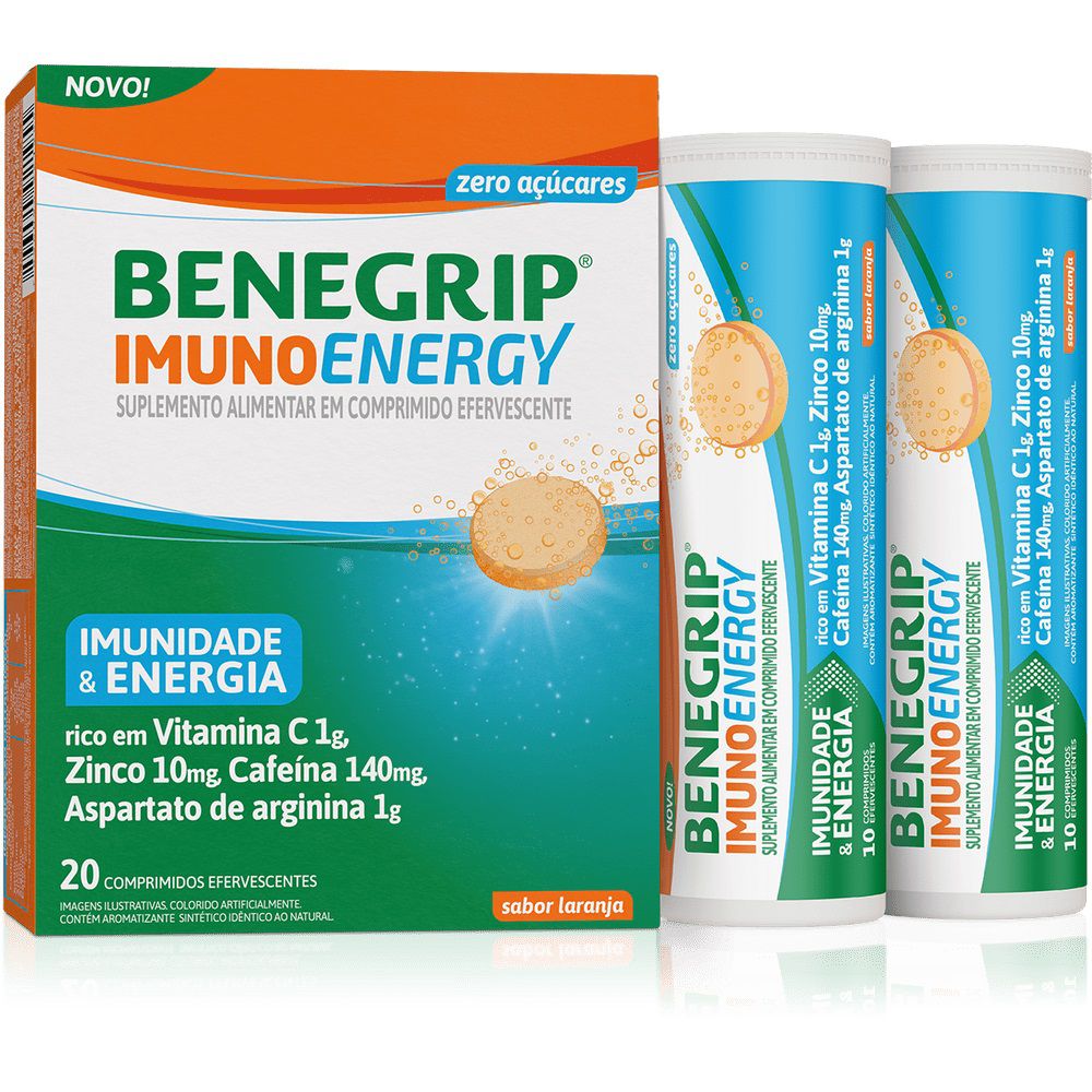 Benegrip Imuno Energy é um suplemento alimentar com vitaminas e minerais e agradável sabor de laranja.