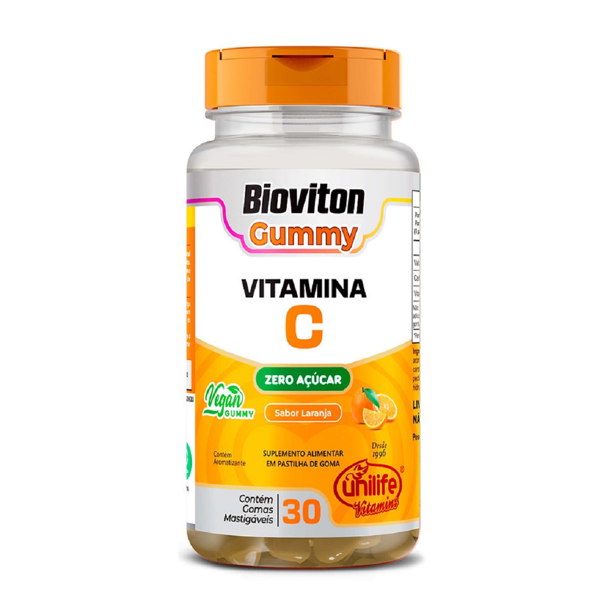 Bioviton Gummy Vitamina C Sabor Laranja Unilife em gomas mastigáveis é suplemento vegano que atua no fortalecimento da imunidade, combate gripes e resfriados, e tem ação antioxidante potente. À base de vitamina C.