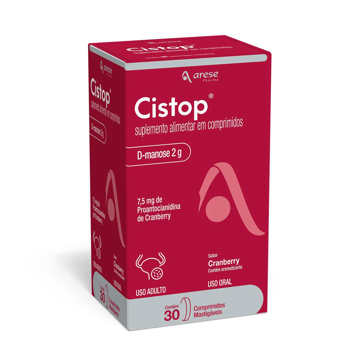 Cistop é um suplemento alimentar composto por D-Manose e Cranberry (proantocianidina de cranberry) em comprimidos mastigáveis.