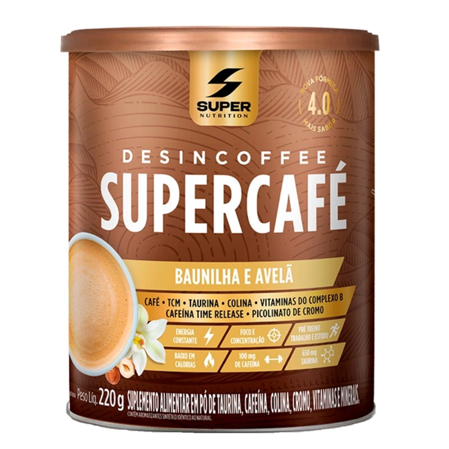 Desincoffee Supercafé Sabor Baunilha E Avelã é um suplemento alimentar em pó.
