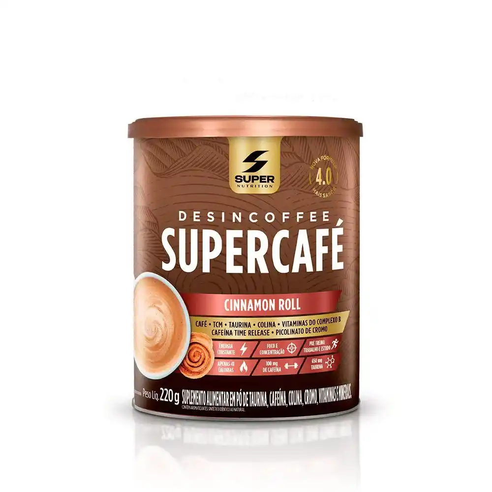 Desincoffee Supercafé Sabor Cinnamon Roll é um suplemento alimentar em pó.