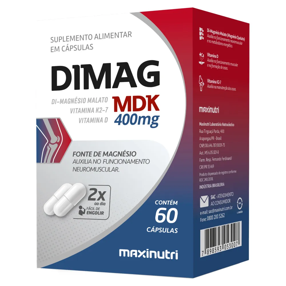 Dimag Mdk 400mg Maxinutri composto por di-magnésio malato, vitamina D3 e vitamina K2-7 em cápsulas.