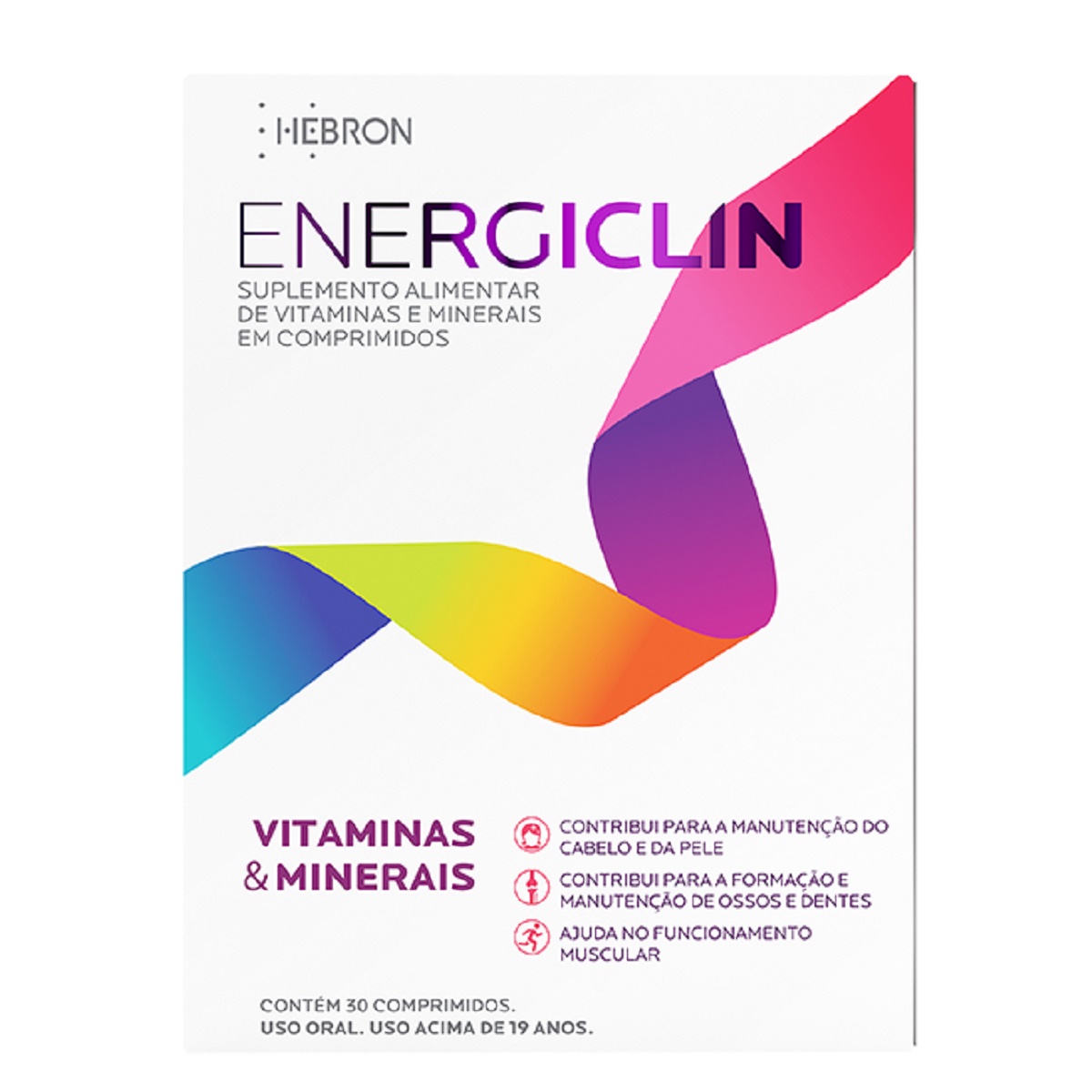 Energiclin Hebron em comprimidos é um suplemento multivitamínico à base de vitaminas e minerais, que atuam para manutenção dos cabelos e da pele,contribui para a formação e mautenção de ossos e dentes. Ajuda no funcionamento muscular.