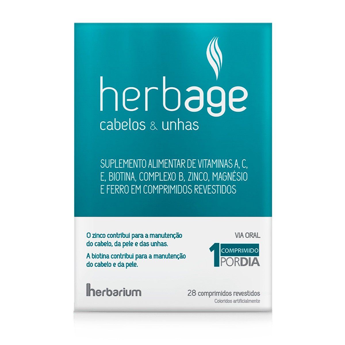 Herbage Cabelos & Unhas é um suplemento alimentar de vitaminas A, C, E, biotina, complexo B, zinco, magnésio e ferro em comprimidos revestidos.