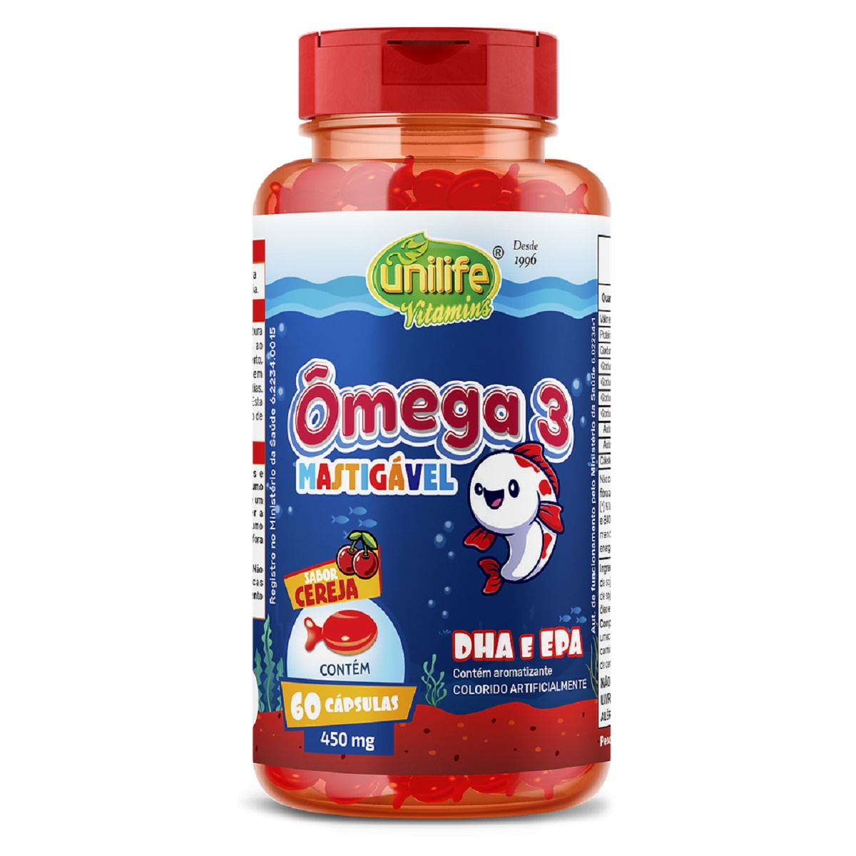 O Ômega 3 Mastigável Sabor Cereja Unilife Vitamins é um suplemento biokosher desenvolvido a partir de óleo de peixe, óleo de coco, maltitol e óleo de soja. Contém DHA e EPA.
