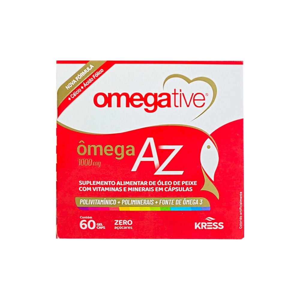 Omegative Ômega AZ é um suplemento alimentar de óleo de peixe com vitaminas e minerais em cápsulas.