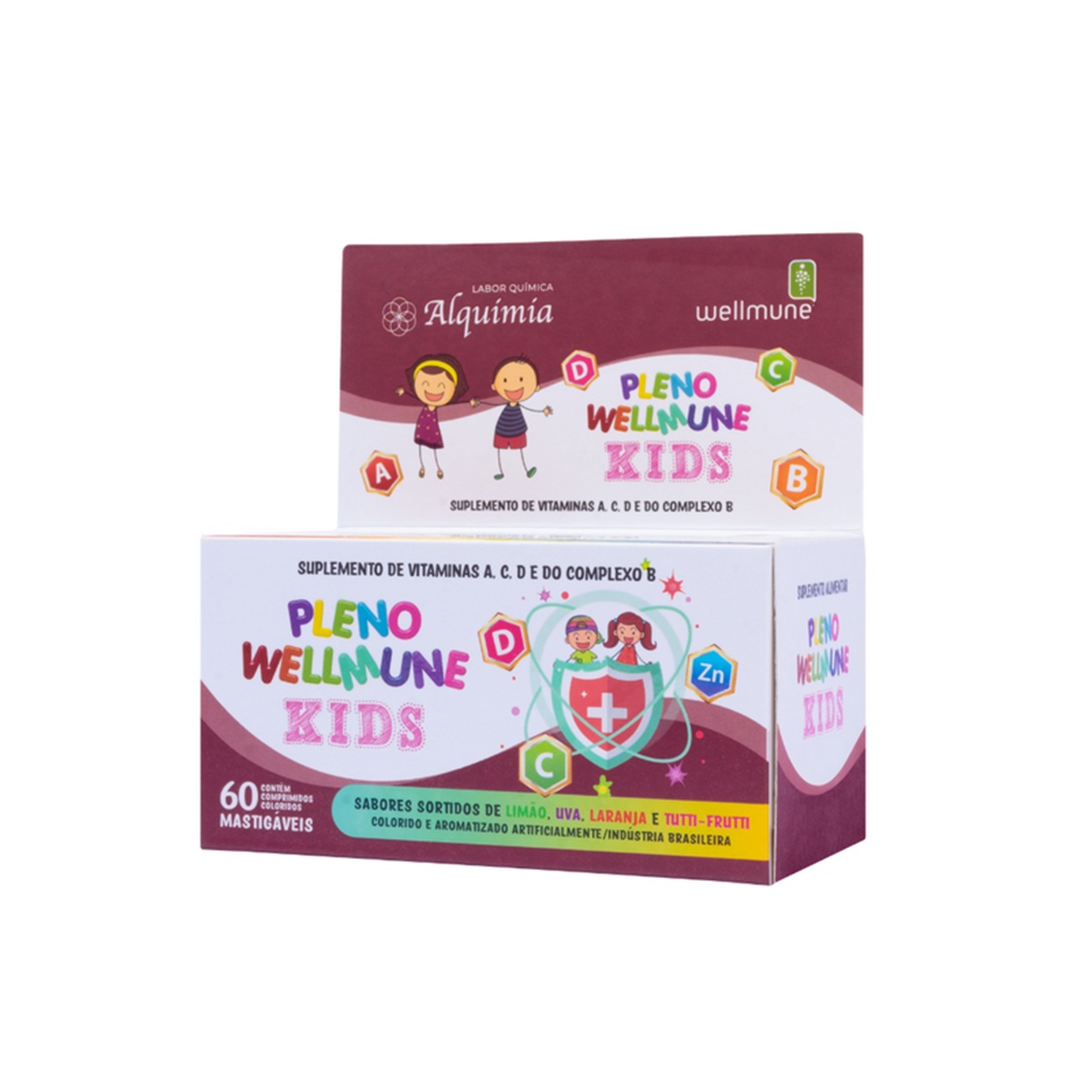 Pleno Wellmune Kids é um suplemento alimentar em comprimidos mastigáveis com Vitaminas A, C, D E do Complexo B.