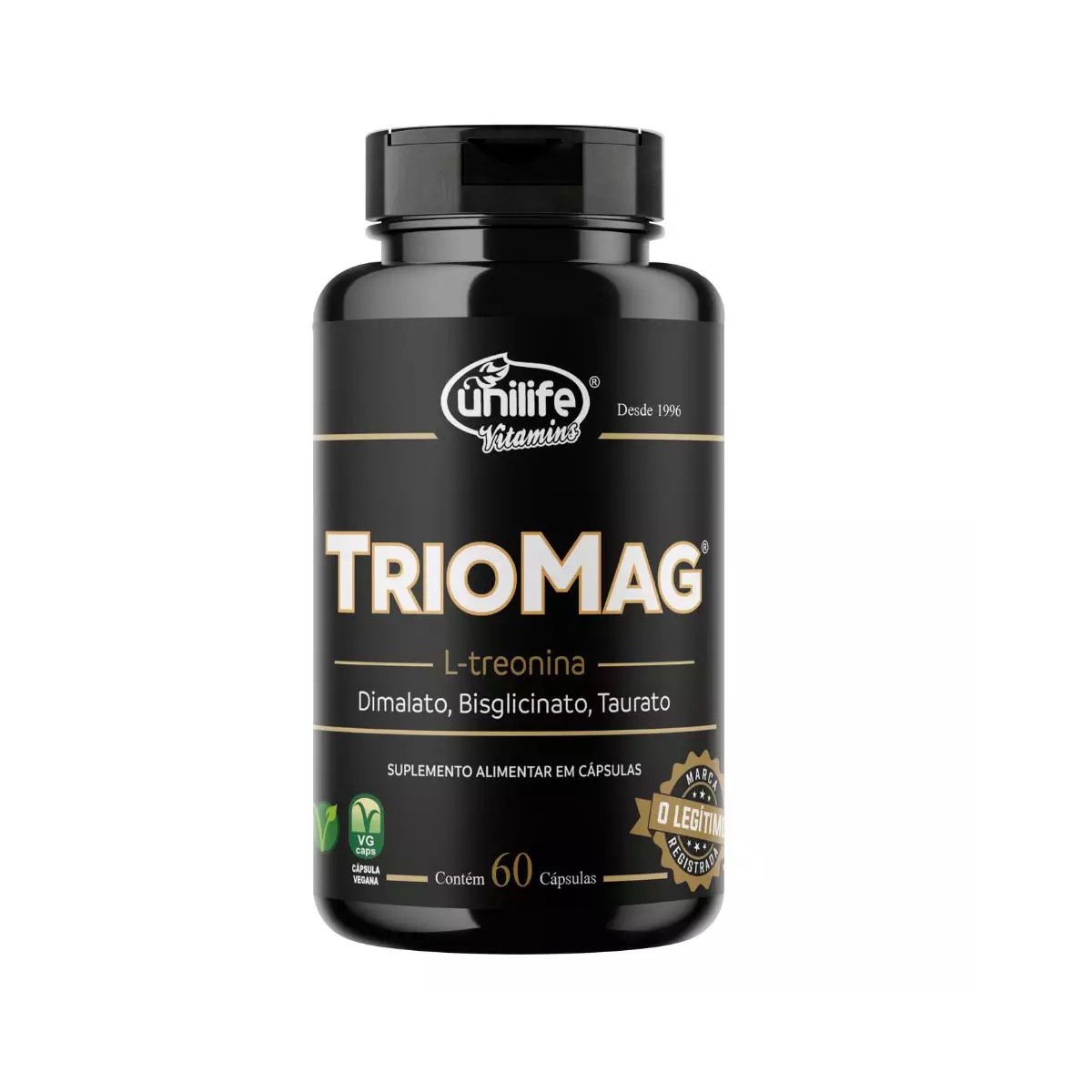 TrioMag Complexo de Magnésio Unilife Vitamins em cápsulas é um suplemento Vegano, desenvolvido a partir de L-treonina, dimalato, bisglicinato e taurato.