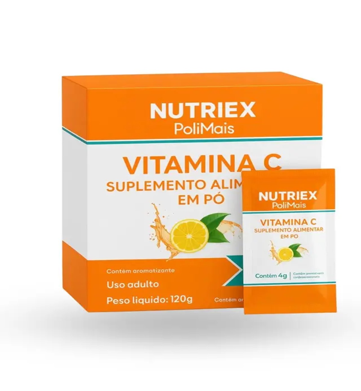 Vitamina C Nutriex PoliMais é um suplemento alimentar em pó sabor laranja.