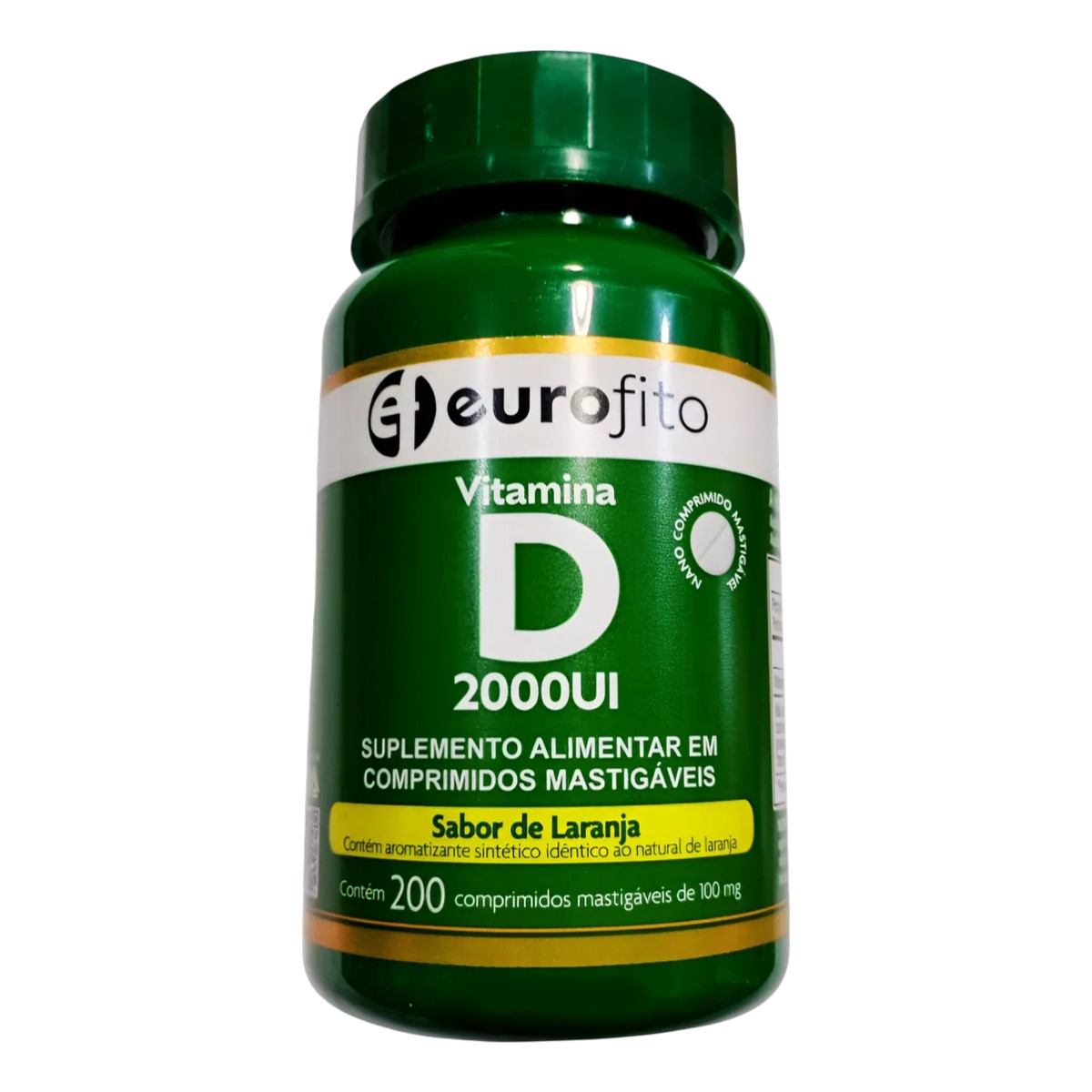 Vitamina D 2000UI Eurofito é um suplemento alimentar em comprimidos mastigáveis com um delicioso sabor de laranja.