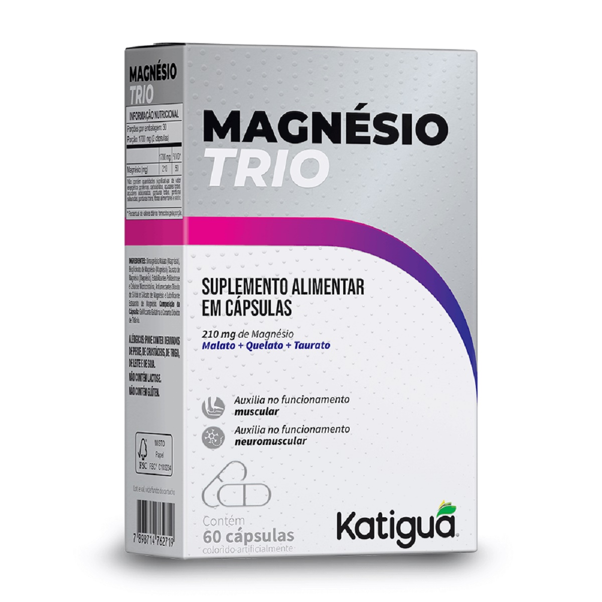 Magnésio Trio Katiguá em cápsulas é um suplemento que atua no funcionamento muscular e no funcionamento neuromuscular, á base de magnésio 210mg +malato+quelato+taurato.
