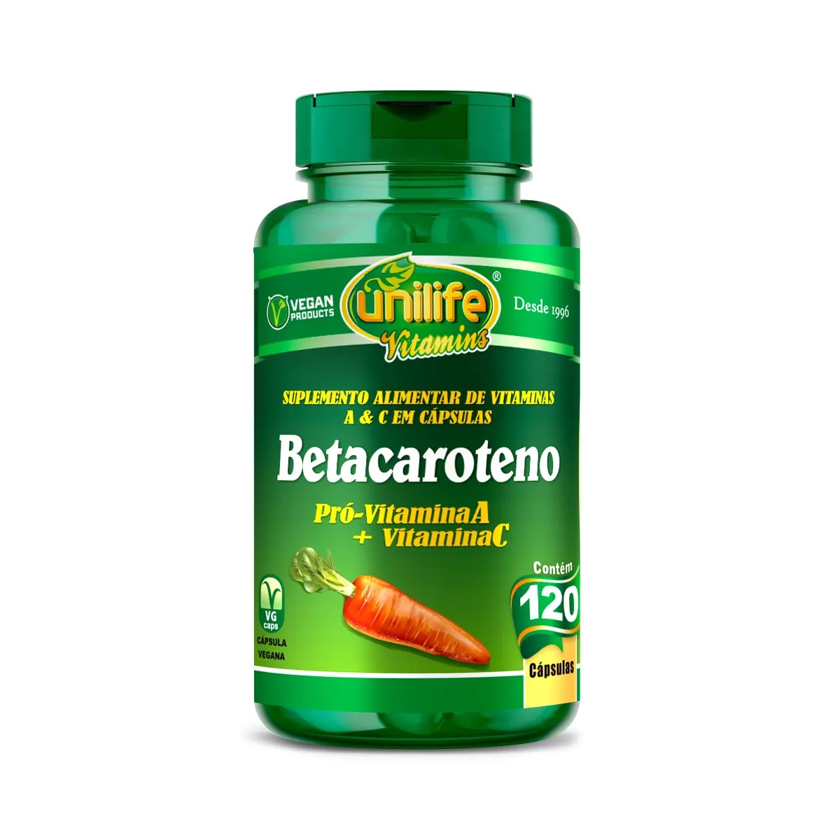 Betacaroteno Pró-Vitamina A+Vitamina C 500mg Unilife em cápsulas é um suplemento vegano, desenvolvido a partir de extrato de betacaroteno e ácido ascórbico revestido (vitamina C). À base de betacaroteno, vitamina A e Vitamina C.
